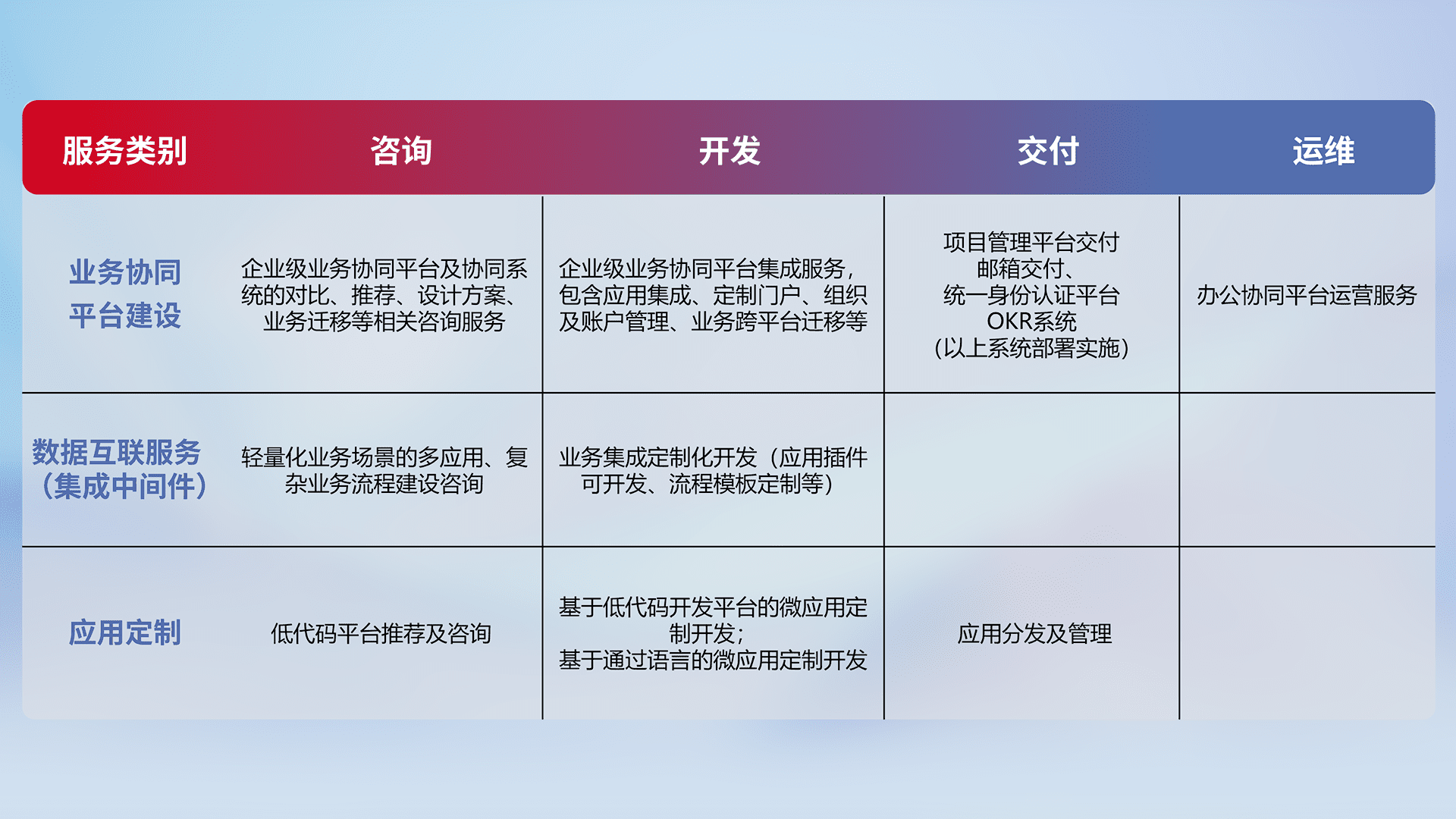 针对钉钉、、企微、、、、IDaas等平台级产品提供产品的规划、、、方案、、、交付、、定制化开发等服务,,,实现如统一协同办公、、、、智能客户服务、、、混合会议管理、、、智能数据查询、、等业务场景,,,实现数字化转型。。。。